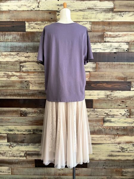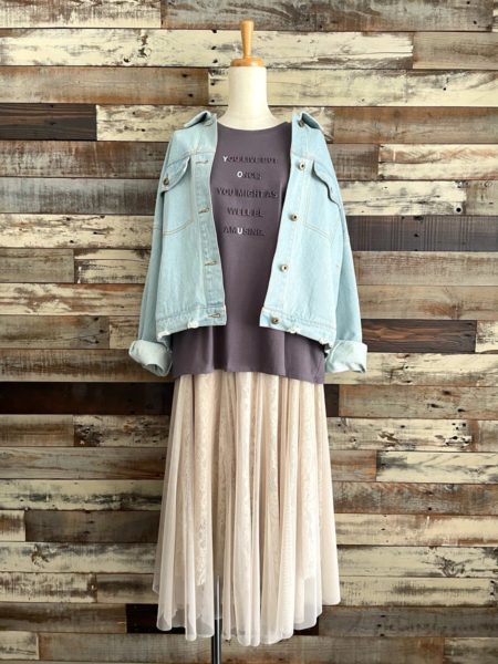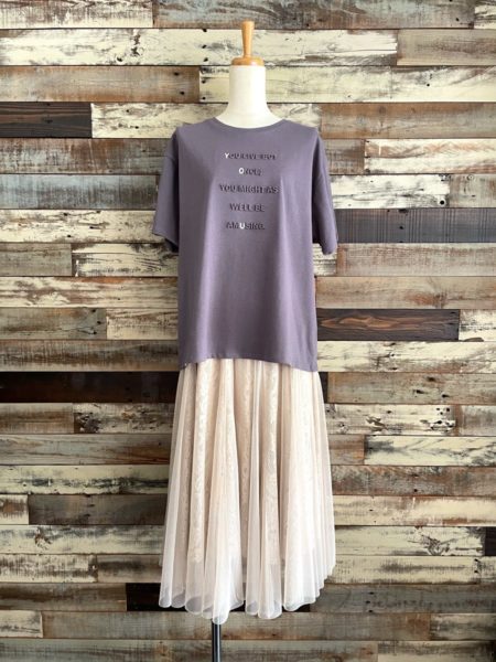 カジュアルなTシャツもボトムを女性らしいチュールやレース、プリーツなどにするだけで大人カジュアルなコーディネートになります。