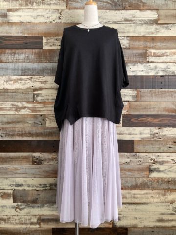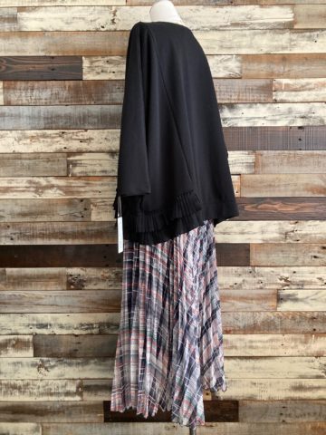 サラッとした生地で、カラダのラインも拾わず、軽やかなプリーツスカートになります。◇『裾プリーツドルマンスリーブプルオーバー』Blackと合わせて↓