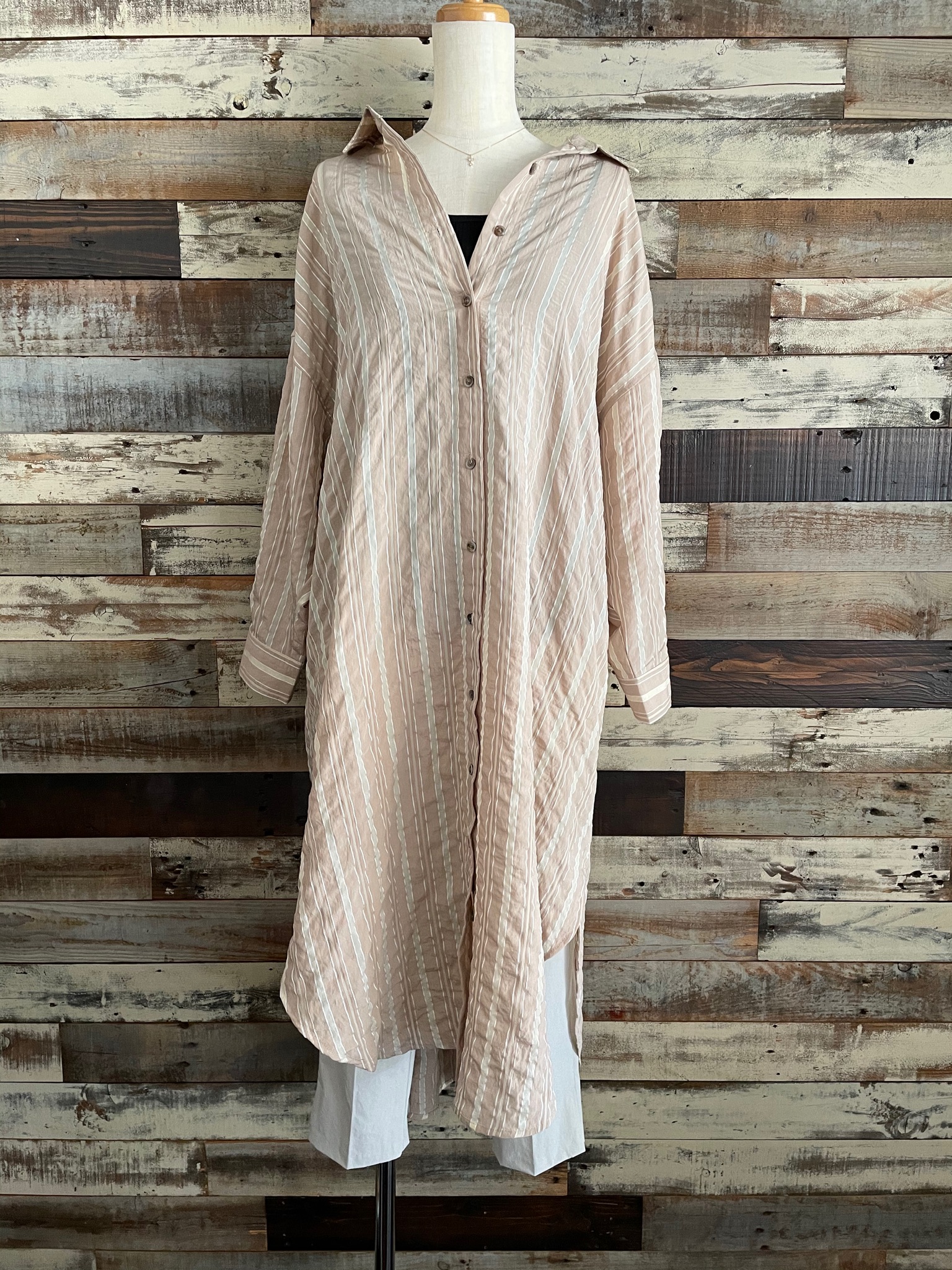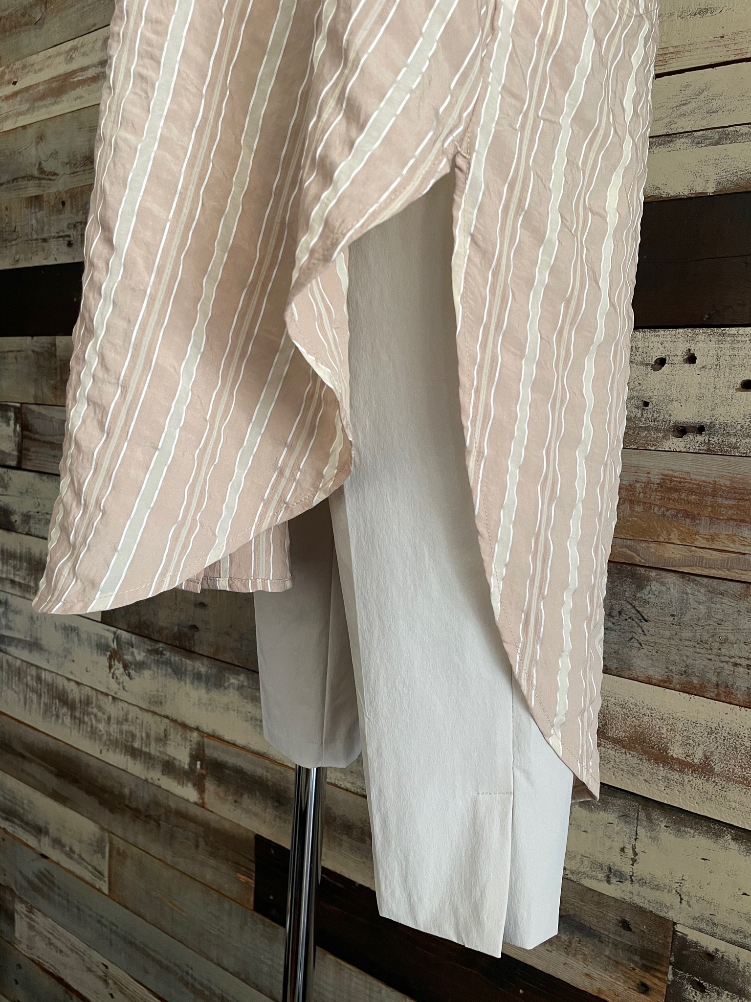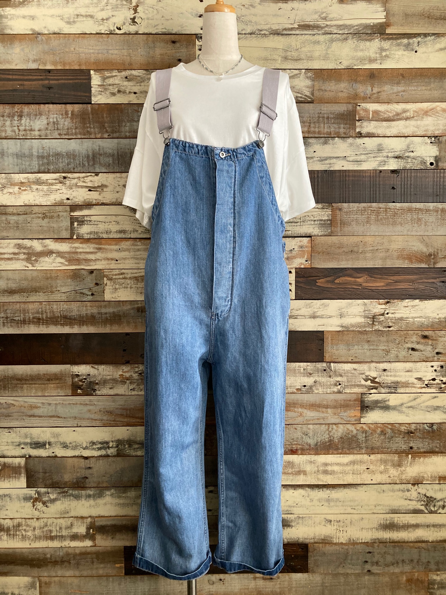 アシンメトリーデザインになり、両サイド着丈が違うので左右の雰囲気が変わりますね。◇『麻混デニムオーバーオール』L.Indigoのインナーにしても↓