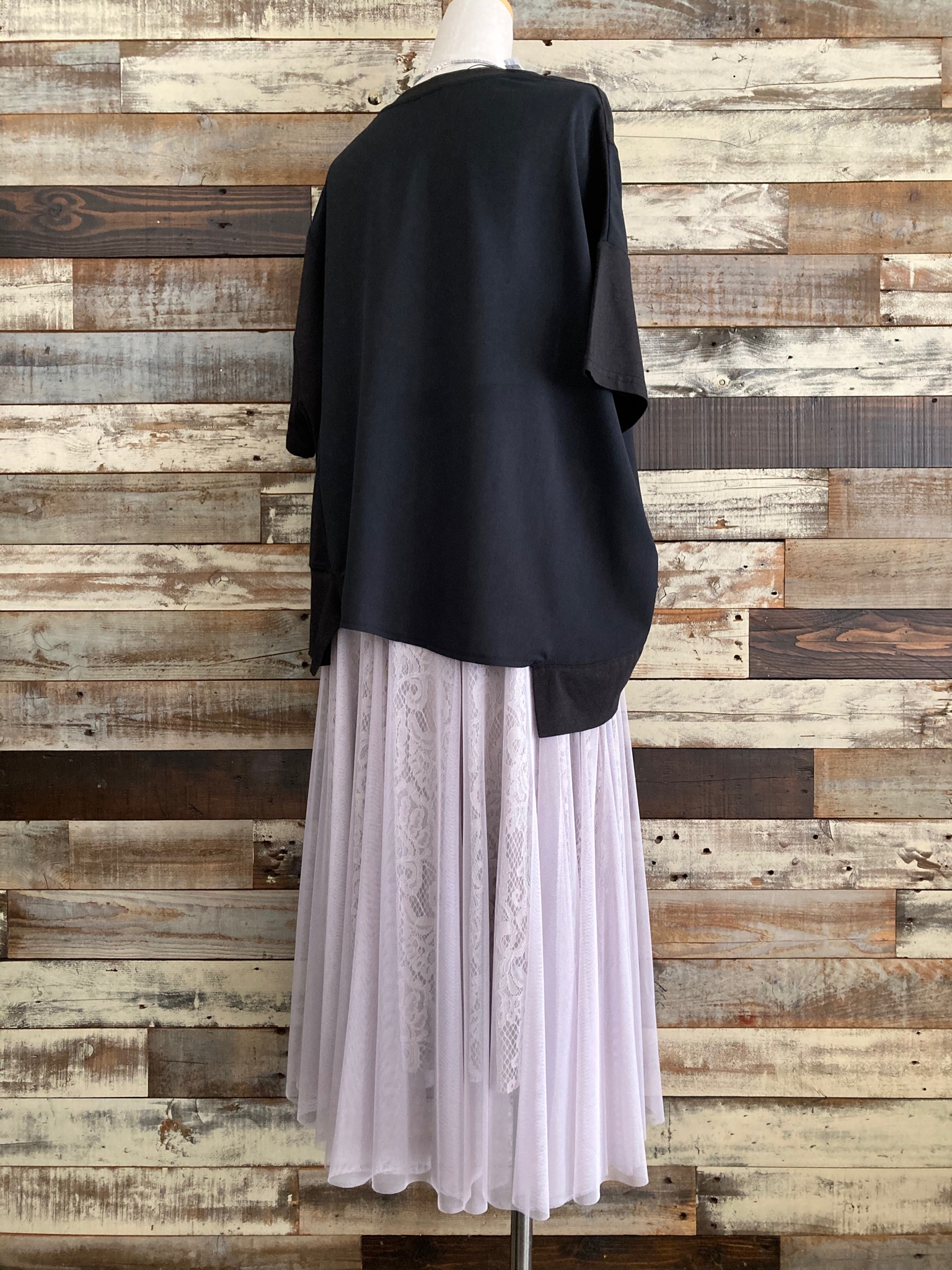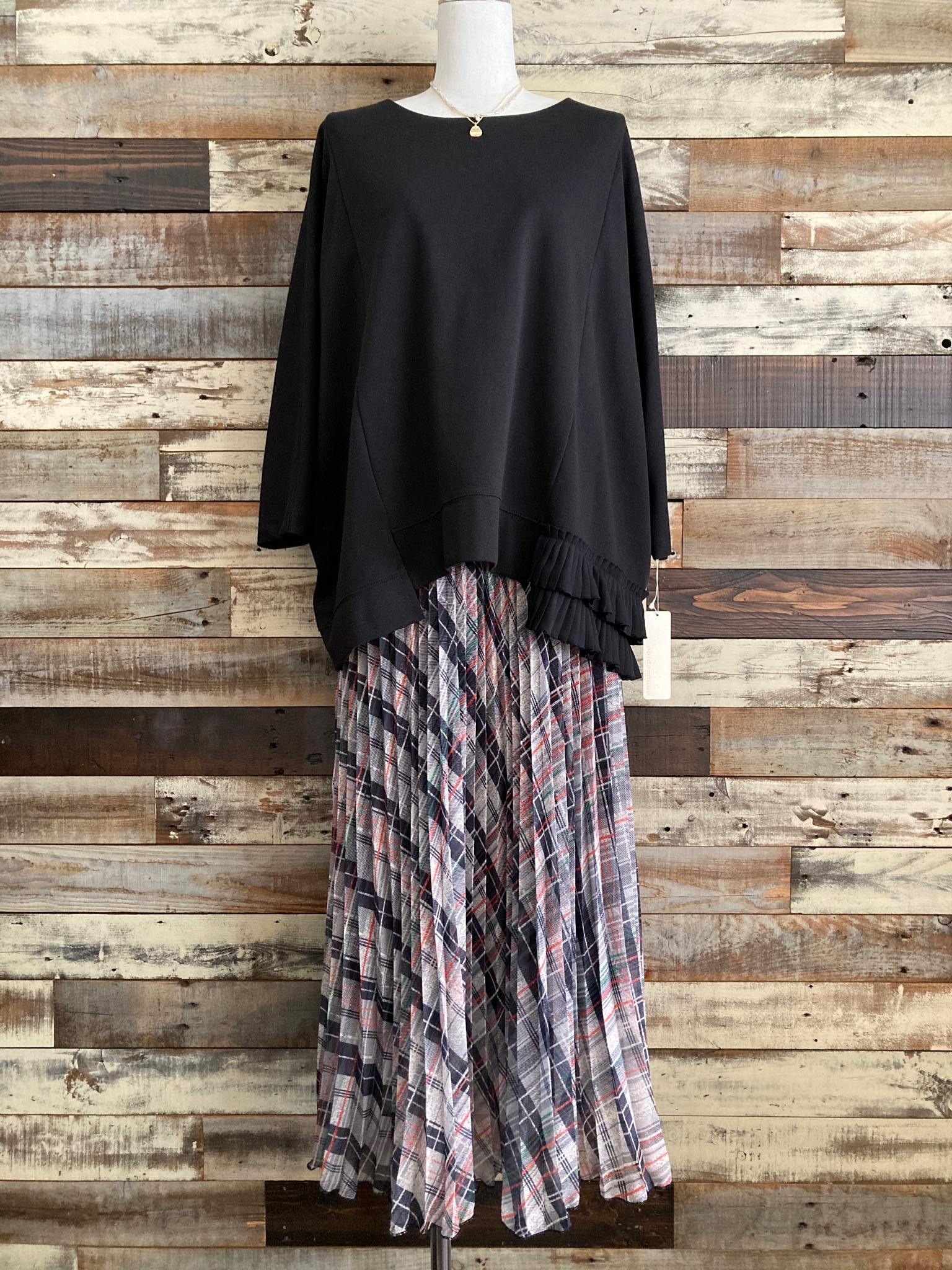 サラッとした生地で、カラダのラインも拾わず、軽やかなプリーツスカートになります。◇『裾プリーツドルマンスリーブプルオーバー』Blackと合わせて↓